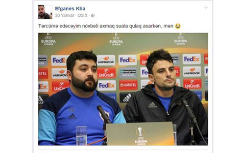 “Qarabağ” klubunun tərcüməçisi Əfqan Xəlilli öz feysbuk səhifəsində qalmaqallı paylaşım edib. Bu barədə "qafqazinfo" melumat verib. Xəbər verilir ki, o, futbolçuları Miçel Madera ilə birlikdə şəkil paylaşaraq üzərinə “tərcümə edəcəyim növbəti axmaq sualı gözləyərkən mən” yazıb. Bununla da mətbuat konfranslarında sual verən mətbuat işçilərini təhqir edib. Həmin foto da təqdim olunub.